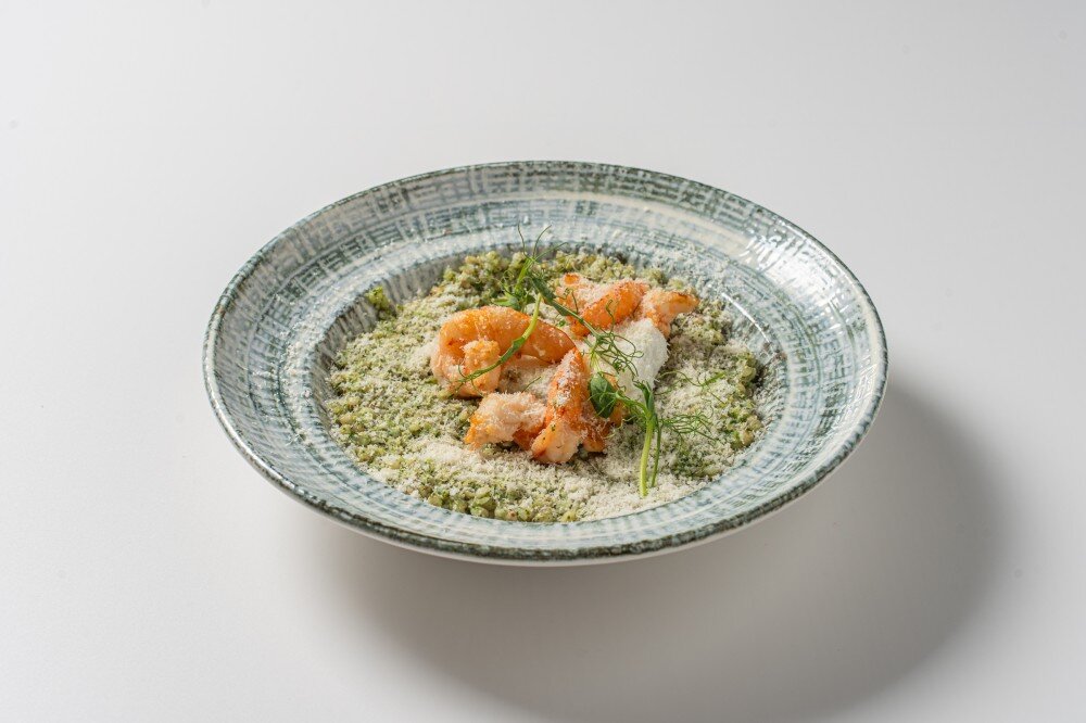 Зеленая гречка с креветками