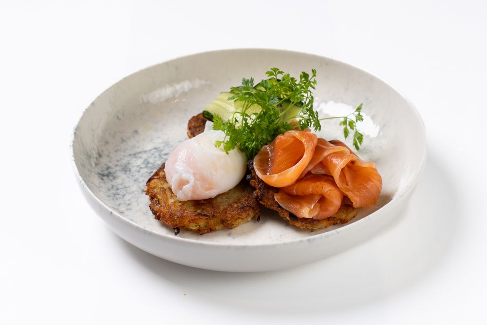 Драники с лососм и яйцом пашот