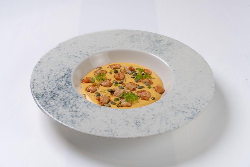 Суп сырный с жареными креветками